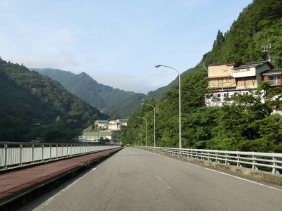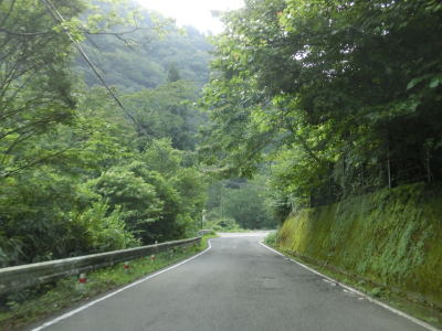 | 飯干峠から約5.5km走ると板谷川集落内で村道との交差点を通過する。国道沿いの家屋は1軒しかないが村道沿いには家屋が点在している。この村道との交差点はY字形状であり、R388方向から来た場合はどちらか国道か分かりにくいので注意を要する。 板谷川集落を過ぎてからは集落のない谷筋の狭路を走る。勾配は緩やかだがカーブは多い。しかし峠の前後に比べると急なカーブが少なくなっている。とは言うものの見通しが良い道路ではない。 |