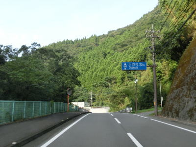| 122.椎葉村の中心部の川寄りを走る | 123.旧道との上椎葉交差点 | 124.「大河内33km」 |