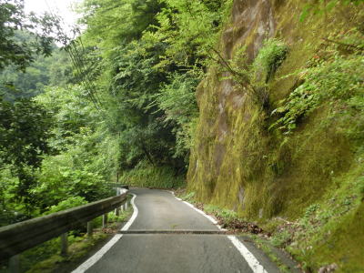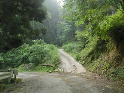 | 川の口橋からは道幅は1.5車線程度と狭くなり、本格的な峠酷道区間が始まる。これまでに通った1.0〜1.5車線幅の狭路区間と比べると路面の散乱物が多くなり、かつ舗装状況が悪くなるのが分かる。 | ||