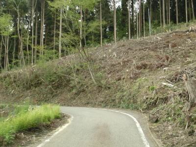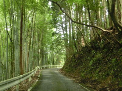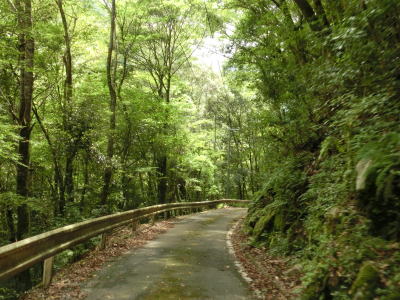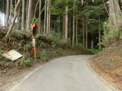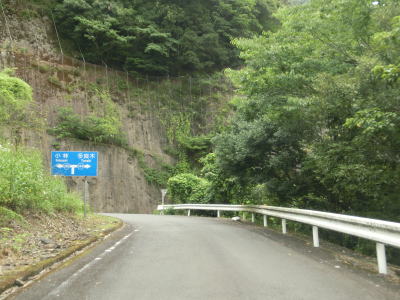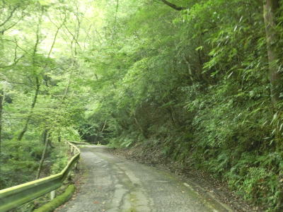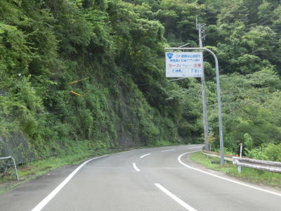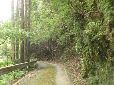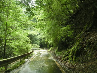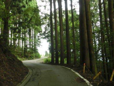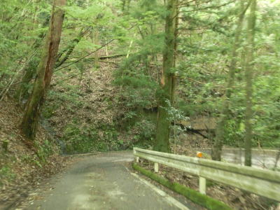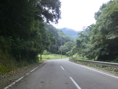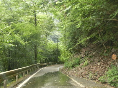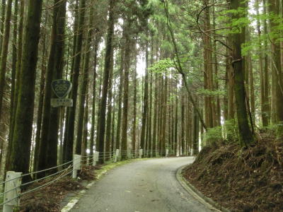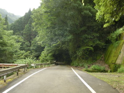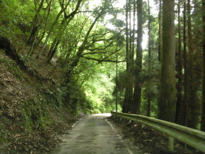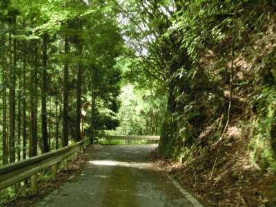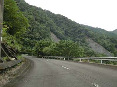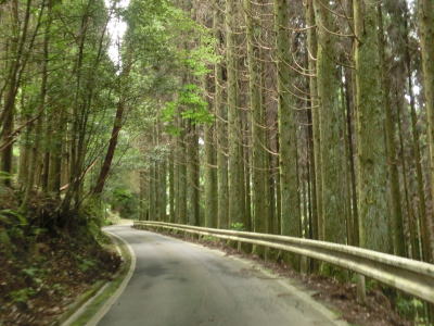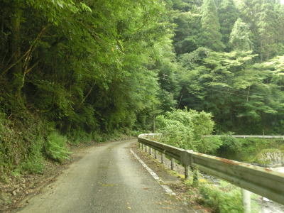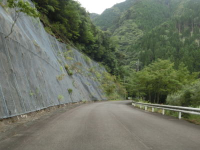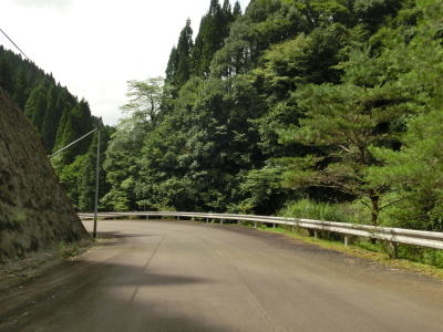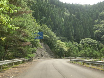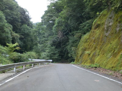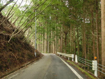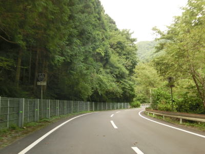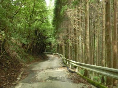 | 杉の木に囲まれた酷道らしい雰囲気の狭路をひたすら走らなければならない。眺望はほとんど利かず単調な景色の中を走る事になる。カーブが多く見通しが悪い状態が長いのだが、対向車が現れる事はほとんどないと思われる。 | ||