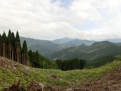 | 標高が800m近くになった所で視界が開ける。木材搬出のためか伐採された場所を走っていると右カーブを曲がって尾股峠を越える。峠の手前からは西米良村の中心部方向を望む事ができる。飯干峠と同様に村境の峠ではないため峠の前後で自治体が変わる訳ではない。 | ||