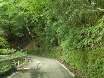 | 尾股小中学校跡を過ぎても1.0車線幅が基本の狭路が続いている。尾股川に沿っているが、高低差が出ており川面を見る事はできない。路肩が崩れかけてガードレールの支柱が宙に浮いている箇所があったが、杭とロープがあるだけで特に通行規制は実施されていない。 | ||