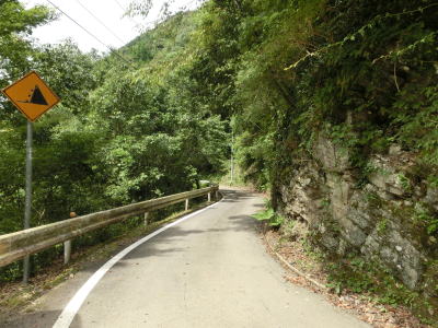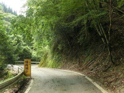 | 山岳狭路をただただ走っていると幅員減少の看板もあった。道幅がすでに狭いと言える状態だが、さらに狭くなる。左のヘアピンカーブを通過して少し走ると右ヘアピンカーブを曲がりながら尾股川を渡る。以降は尾股川に沿っているが、高低差があるため川の水は見えない。 | ||