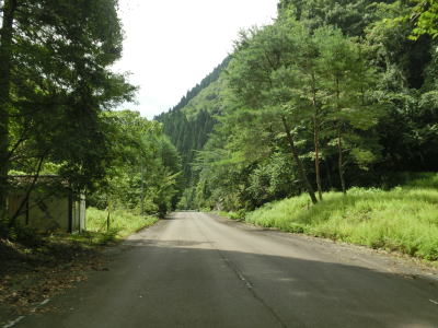 | 尾股峠から約5.7km走ると消えかけているとは言えセンターライン付きの2車線道路になる。かつては尾股という名の集落があった場所だが、既に廃村となっており家屋はほとんど確認できない。川沿いに狭い平地がいくつか見られるが、そこに家屋等の建物が建っていたかもしくは田畑であったと思われる。2車線区間は意外に長く続いており、蛇行する尾股川を何度か渡りながら比較的緩やかなカーブとなっている。案内標識が設置されているもが夏という植生が旺盛な時期とあって樹木によってかなり見にくくなっていた。そこに記された内容は綾(宮崎県綾町)まで70km、須木(小林市須木)まで30kmというものである。 | ||