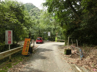 | 左ヘアピンカーブを曲がった後に鶴瀬谷川を渡って左岸に移り、程なくして上板谷集落を通過する。この集落が西米良村側の実質的な最後の集落である。集落内に17km先の工事に関する予告看板が設置されており、それによると防災工事のため8〜17時の間で時間帯通行止規制となる。1時間45分〜2時間の通行止と15分の通行可を繰り返す規制で、よくある1時間サイクルとは異なっている。なお、夜間と日曜日は開放されており、期間は2018年12月2日までのようである。 上板谷集落を通り過ぎてからもセンターライン付きの2車線道路が続いている。集落のメイン部分は過ぎているがそれより奥にもまだ家屋は存在している。ただし、定住されているかどうかは不明である。 |