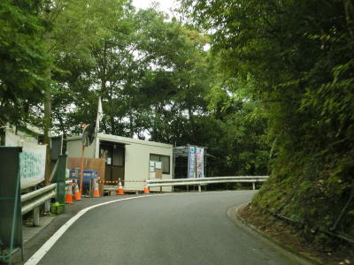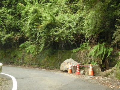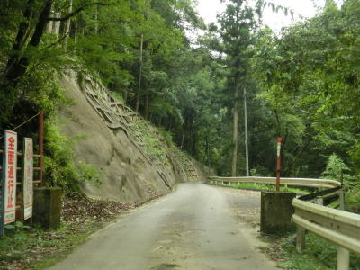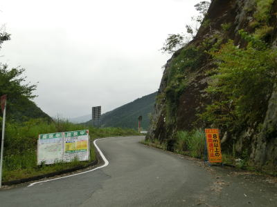| 来る可能性の低い対向車の存在に気を遣いながら狭路をひたすら走る。落石が転がっている事もあるが、椎葉村から走ってくればもう見慣れた光景である。重永林道が交差するカーブを左に曲がって西股谷を渡った直後に閉鎖用の簡易ゲートが設置されている。ゲートの市街地よりには転回用のスペースが設置されているが、大型車両の転回は不可能と思われる。 | ||