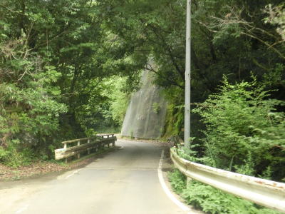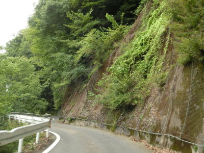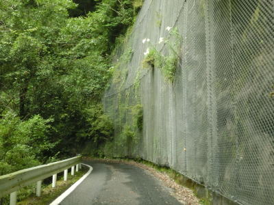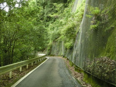 | 蝉の谷の西側の山の斜面を走っているが、勾配はほとんどないものの道幅は1.0〜1.5車線と狭く断崖路となっている。落石防止ネットが所々に設置されているが、それでも落石は防ぎ切れておらず、当たったら絶命しそうな大きさの岩も路肩に転がっていた。時折、視界の開けた場所を走るが、所詮は谷間なので雄大な景色とは言い難い。 | ||
