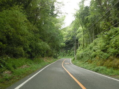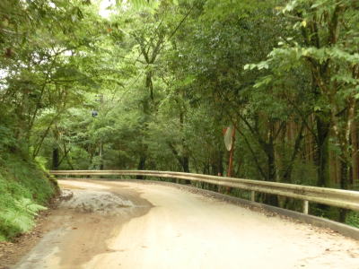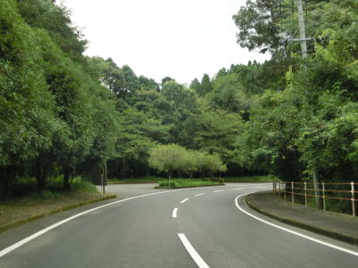 | 工事現場を過ぎると幾分か道幅が広くなるが、それでも離合が容易と言える幅ではない。ほとんど眺望のない状態を走っていると右にカーブして眺望の利かない輝嶺峠を越える。この峠も市町村界の峠ではなく、峠の前後共に小林市である。峠を越えると緩やかな下り勾配となる他の道路状況に変化はなくカーブの多い狭路を走る。 | ||