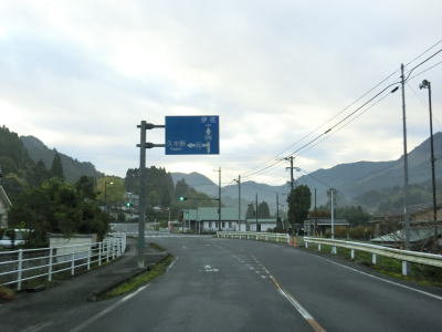 | 中町交差点からはR267との重複区間を走る。400m弱で高熊山が案内されている市道との交差点を通過するが、ここを左折するとR267の旧道に行く事ができる。久七峠バイパスが全線開通した後に国道から降格しているが、ウオッちずでは2022年11月時点でも国道扱いされている。 ごく緩やかな勾配を下った先でR267・R447交差点を通過する。R267との重複区間は終わるがR447の重複区間が始まる。左折の大口ふれあいセンター方面はR267旧道であり、案内標識に表記されていたえびのが消されている。久七峠バイパスが供用される以前はR267とは重複ではなく交差しているだけであった。 |