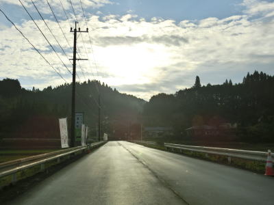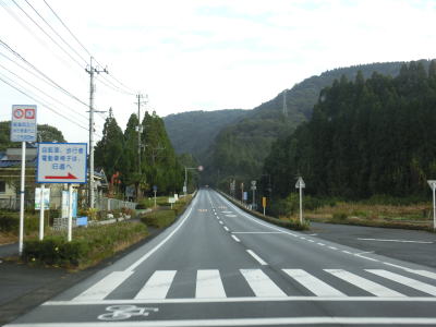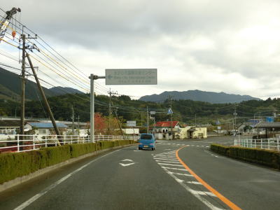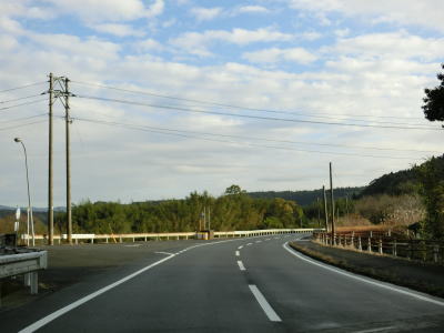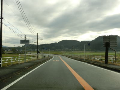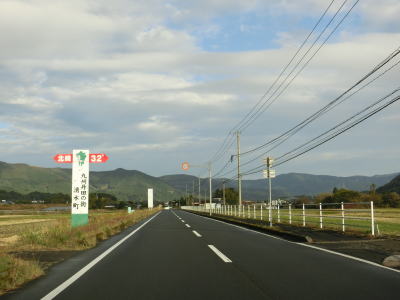 | 旧道と合流して少し走ると谷筋から開けた場所に出る。右カーブを曲がって矢立橋を渡って町道との交差点を通過して左カーブを曲がって桶寄橋を渡る。水田が広がっている中を走っていると北緯32度線を通過する。緯度に関する看板が設置されている所には同じ緯度の都市名が表記されているものが見られる事が多いが、ここには北緯32度を示すものだけである。 | ||