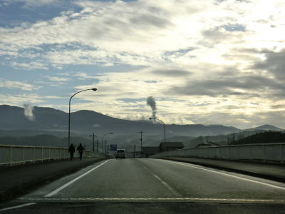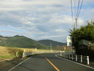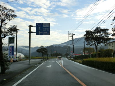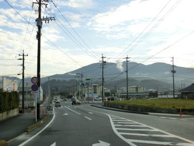 | 栗野橋で川内川の左岸に移って湧水町の中心部と言える場所に入る。西方の山の2ヶ所から白いものが立ち上がっているのが見える。左側は栗野岳八幡大地獄、右側は新燃岳の噴煙と思われる。 左カーブを曲がると鹿児島r55栗野橋交差点を通過する。右折してr55を約600m走るとE3九州道の栗野ICがある。さらに少し走ると鹿児島r444交差点を通過する。右折すると湧水町役場や栗野駅に行く事ができる。栗野駅はJR肥薩線に属する駅であり、廃線になった山野線の終点であった。 |