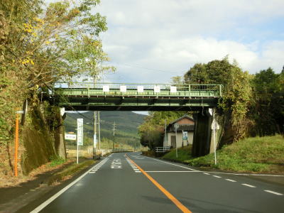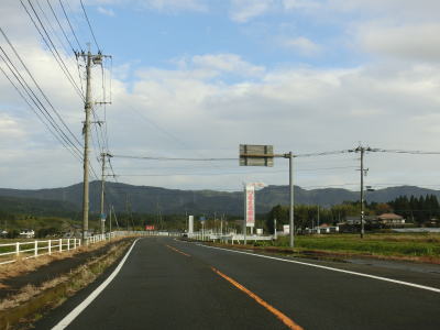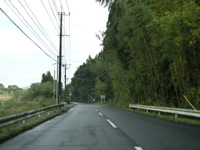 | 右カーブを曲がり終えた直後に県境を越えて宮崎県えびの市に入る。熊本県・鹿児島県境は名称は付けられていないものの峠だったが、鹿児島県・宮崎県境は平坦な場所で県境感は薄い。また、宮崎県の境標識が設置されていないように思えるが、反時計回りに90度回っており見えないだけである。宮崎県に入ってからは川内川とJR吉都線との間を緩やかなカーブを繰り返す2車線道路で走り抜ける。 | ||