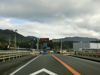| 少し開けた綾織集落を走っていると旧道との交差点を通過する。上り勾配の先の川添トンネルは歩道が設置されていないせいか、歩行者や軽車両等の通行が禁止されている。そのため歩行者や軽車両、電動車椅子は旧道へ進むように案内されている。電動車椅子はおそらくシニアカーを指していると思われる。川添トンネルを抜けて緩やかな勾配を下っていると旧道との交差点を通過する。この交差点までの約2.2kmが歩行者・軽車両等通行禁止区間である。 | ||