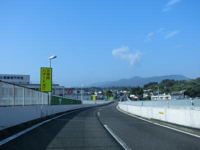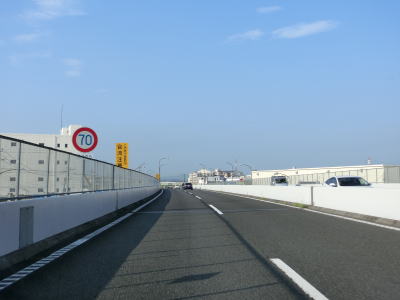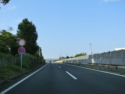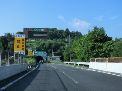 | 荻窪ICを過ぎると舞鶴高架橋渡って風祭トンネルをくぐる。橋を渡り切った直後から車線変更禁止区間が始まる。1km以上手前から警告されていたが、これより先は終点まで車線の変更ができない。ただ、センターラインをよく見るとオレンジの実線の右に白い破線が引かれているため、右側車線から左側車線への変更は可能と思われる。 | ||