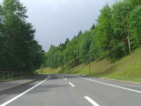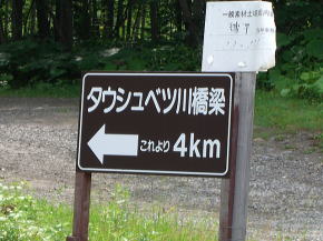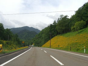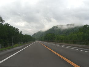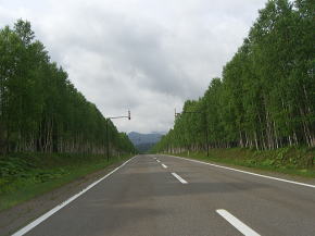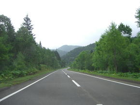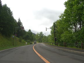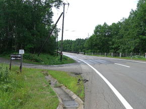 | ダイナミック樹海区間を過ぎると白樺(?)の間を抜ける緩やかな下りとなる。北海道らしい走りやすい道路が続く。15km以上もそんな状態が続くが、今回は途中で寄道をしている。今まで海沿いに走ってきてここで内陸に入った目的の地に向かうためである。渡鹿橋と丸山橋の間から出ている林道に進路を取り一旦R273を外れる。 | ||