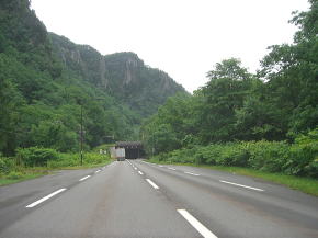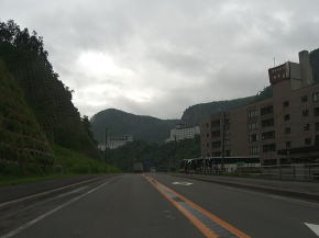 | 上り続けていると層雲峡温泉となる。山間部に突如現れるリゾートホテル風の建物に少々面食らう。行楽シーズンの休日にはここに向かう車で交通量が相当増える事は想像に難くない。筆者の走行時は夏休み期間中とは言え平日だったので交通量は極僅かだったが、ホテルの駐車場には大型観光バスが数多く停まっていた。 層雲峡温泉を過ぎると民家すらない風景に戻る。銀河トンネル、大函トンネルと2つの長大トンネルを抜けてなおも登り続けると大雪湖交差点となる。ここの右折してR39から分岐し単独となる。R39との重複距離はおよそ29kmである。 |