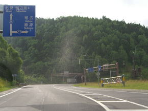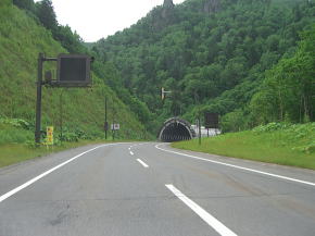 | 大雪湖交差点から10km程走ると三国トンネルの入口が見えてくる。北海道最高所の峠の三国峠である。トンネル前後をスノーシェッドで覆われたトンネルを抜けると上士幌町に入る。トンネルを抜けた直後には三国峠PAが設置されており、車を停めて雄大な樹海の景色を眺めることも可能。トイレと売店もあるので休憩にも良い。筆者の訪問時はまだ売店が開く時間ではなかったので景色を見るだけになってしまった。 三国トンネルから6kmに渡っては樹海の中をダイナミックに抜ける気持ち良い道路となっている。勾配・カーブともにきついのであまり運転者としてはあまり景色にばかり見とれているわけにいかないのが残念だ。 |