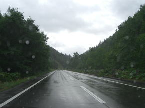 | 25.大雪湖沿いのアップダウンのある道路を走る | 26.5分前の晴れ間が嘘のような強雨に見舞われる | 27.5分も走れば雨があがった |