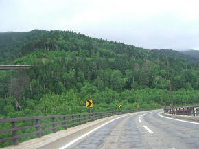 | 大雪湖交差点を右折するとすぐに大雪ダムの天端を通過する。ダム天端通過直後は樹海トンネルとなるなど、結構目まぐるしく景色が変化する。大雪湖の西岸沿いの急勾配の下りを進み、大雪大橋を渡ると湖から離れる。この区間も今までと同じような道路状態で交通量の少なさも手伝って走りやすい状況となっている。 | ||