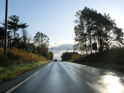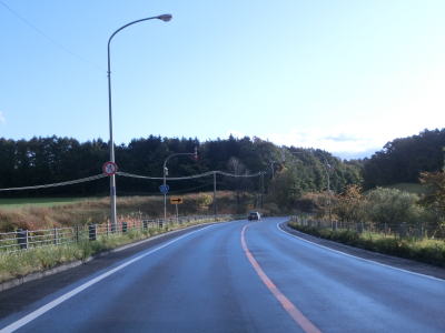 | 千歳市に入ってからも走りやすい2車線道路が続いている。中央分離帯が現れて緩やかな右カーブを曲がっていると由仁町に入る。千歳市域を通っている距離は1.1km程度と非常に短い。なお、長沼町と由仁町は空知総合振興局に、千歳市は石狩振興局に属している。市町境付近のカーブが終わると直線道路になる。 | ||