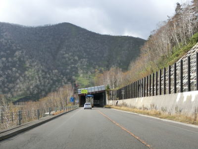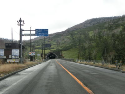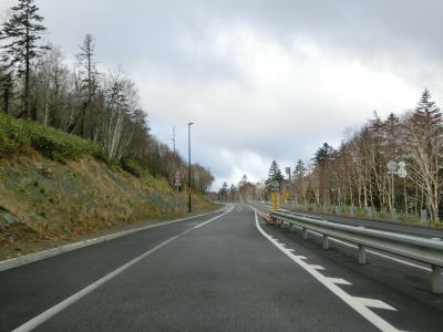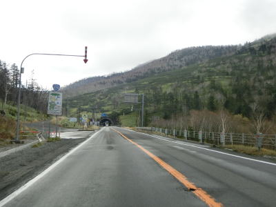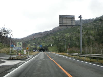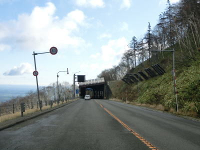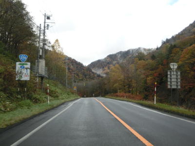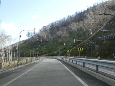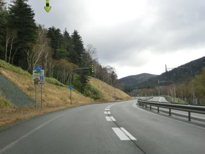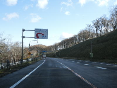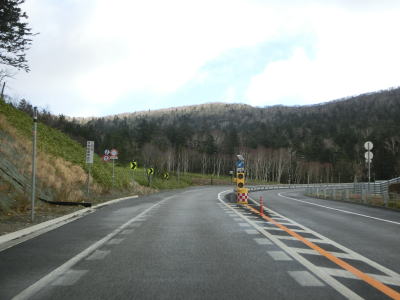 | 登坂車線が終わると同時に中央分離帯もなくなって通常の対面2車線道路に戻る。上り勾配はまだ続いており標高940mの9合目を超える。沙流川の源流の近くで中央分離帯付きのヘアピンカーブを曲がる。 | ||