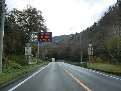 | 沙流川の左岸を走っていると支流のパンケヌーシ川に架かる占瀬橋を渡る。その先に電光掲示板が設置されているが、北海道内の多くの国道の電光掲示板は日本語と英語が交互に点灯するものが多い。 | ||