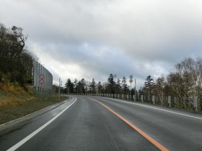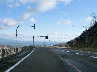 | 左カーブを曲がって直線道路を下っていると通常の対面2車線道路に戻る。直線区間に緊急待避所が設置されているが、ブレーキ故障時以外は進入できないようにラバーポールが立てられている。中央分離帯のある左カーブを曲がると視界が開けるようになる。右カーブを曲がって中央分離帯がなくなった直後に閉鎖用ゲートを通過する。日高町側のゲートからの距離は約37kmである。 | ||