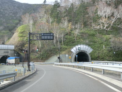 | 上滝トンネルを出た直後に沙流ダムの脇を通るが、ダム本体が大きくないためただの水門に見える。沙流川にウエンザル川が合流する地点で新清見橋を渡って清見トンネルに入る。トンネル坑口の右には別のトンネルが見えるが、これは旧清見トンネルである。旧トンネルの南の橋は合流地点の手前だったため、沙流川とウエンザル川のそれぞれに橋が架かっていた。なお、ウォッちずでは“新清見トンネル”と表記されているが、扁額は“清見トンネル”となっている。 清見トンネルを出てすぐに3号目を通過して鹿鳴トンネルに入るが、トンネル間は旧道がそのまま改良されており、トンネル部分は川沿いに旧道があった。どちらの旧道も閉鎖されており通行する事はできない。 |