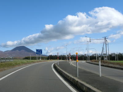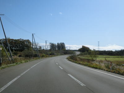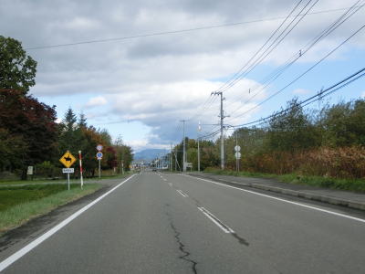 | 前方に石狩岳と思われる山容を見ながら直線道路を走る。笹川集落では「馬横断あり」という警戒標識があるが、ピクトグラムは人が乗っている馬である事から野生の馬ではなく牧場で飼われている馬を指しているのだろう。 | ||