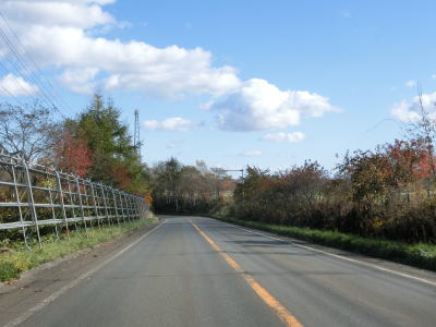 | 牧草地帯になると防雪柵が設置されている。意外に思うかもしれないが北海道内は防雪柵が設置されている区間はさほど多くない。左カーブの先で久著路川に架かる境橋を渡って標茶町に入る。 標茶町に入ってからは緩やかな勾配を下って久著路集落を走る。S字カーブを走っていると北海道r1052交差点を通過する。右折してr1052を南下すると北海道r243を経て北海道r1060で塘路湖に行く事ができる。r1060は釧路湿原の中を通っている区間があり、未舗装ながら平坦で走りやすい道路である。なお、湿原内を通っているため降雨時は通行止になりやすい。 |