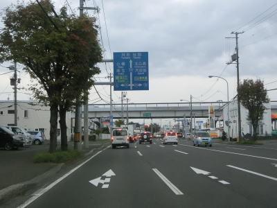 | 左にカーブして豊平川から離れた後に東苗補13・東雁来1-1交差点を通過する。交通量の多い4車線道路を走っているとR274東雁来町交差点を通過する。交差点の上を横切っている高架はE5A札樽道であり、左折してすぐに所に雁来IC(小樽方面への入口と小樽方面からの出口)がある。 | ||
