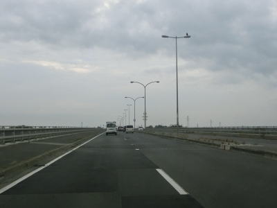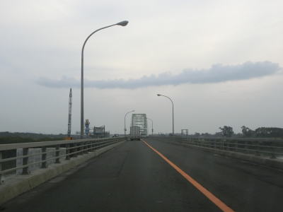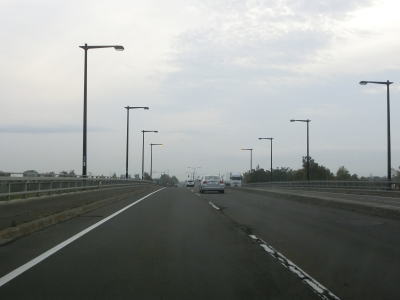 | 周囲に工場が増えた所で北海道r128角山交差点を通過し、緩やかな勾配を上っていると北海道r1056角山交差点を通過する。ここで右側車線がr1056への右折専用車線になってしまう。また、r1056はR337の旧道に当たる区間だが、2017年4月1日に国道から道道に移管されている。当サイトのR337のレポートは2013年に走行しているため、降格した区間を走行している。 R337旧道との交差点を通過するとすぐに新石狩大橋を渡る。車線が減少したため対面2車線道路だが、下流側に新たな橋が建設中であり、完成すれば片側2車線になるものと思われる。 |