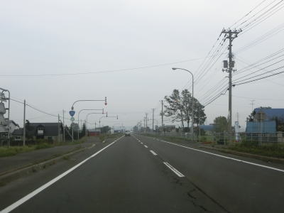 | 江別市に入ると直線かつ平坦な片側2車線道路を走る。札幌市の近郊と言える場所だが周囲には田畑や牧草地が広がっており長閑な風景である。ただし、交通量の多い幹線国道なのでのんびりした雰囲気はあまり感じられない。北海道r46角山交差点を過ぎると右カーブを曲がり、その後に角山橋を渡る。以降も直線道路が続く。 | ||