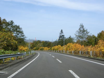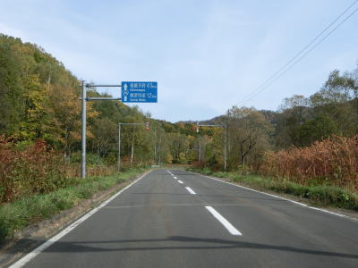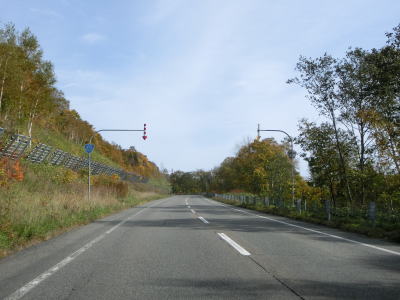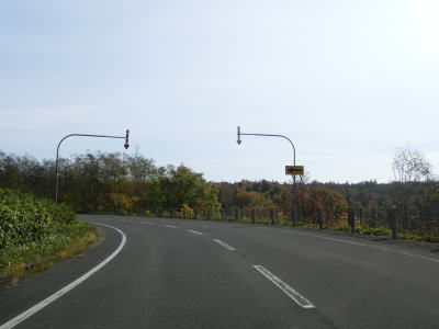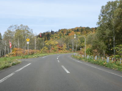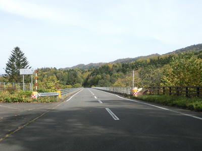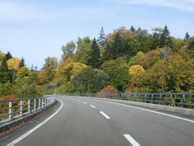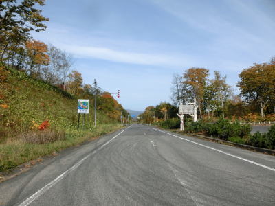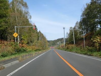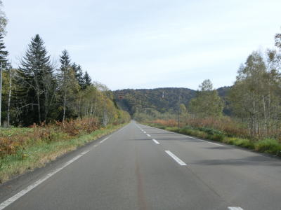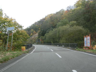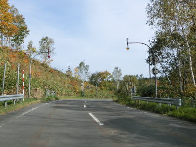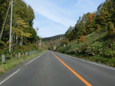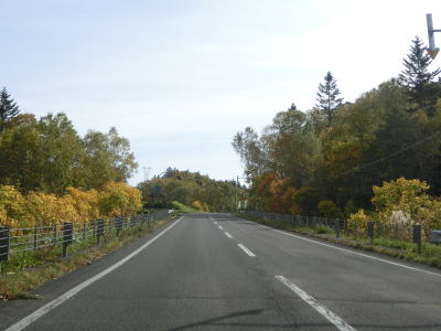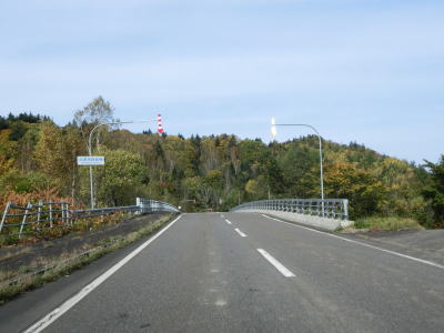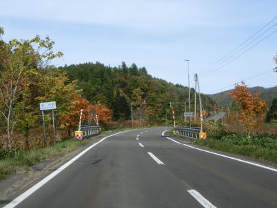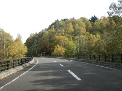 | 北海道r688交差点から約4.6km、左にカーブした先で美深峠を越えて美深町に入る。峠の脇には駐車場があるがトイレも展望台もない。駐車場内とその前面道路に夥しいタイヤ痕が見えるが、舗装工事の際に付いたものではなくドリフトもどきの痕と思われる。 美深町に入ってからは下りとなるが、その勾配は緩やかで急カーブもないため走りやすい。標高は500mに満たないが北緯が44度と高いためか紅葉している木が目立つ。右カーブの後に峠橋を渡り、次いでうるべし橋を渡る。うるべし橋の手前にも駐車場がある。 |