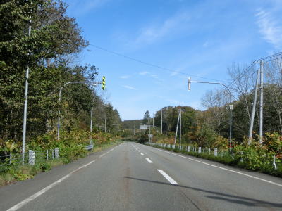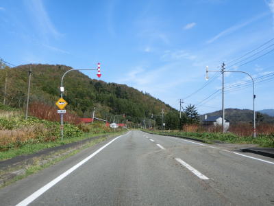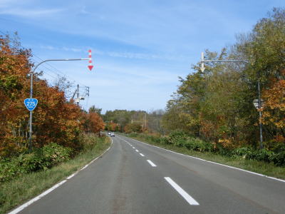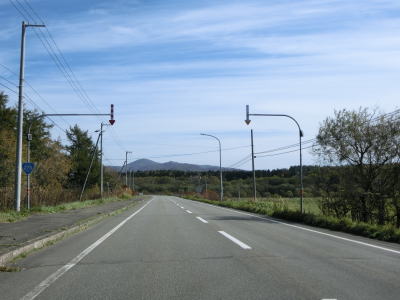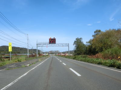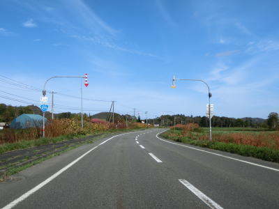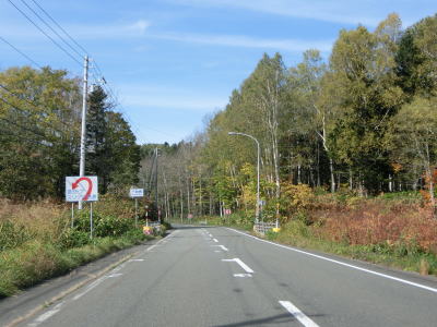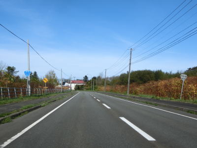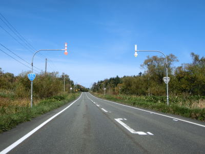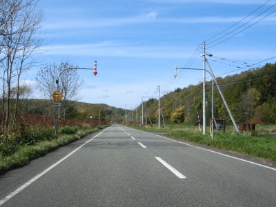 | 北海道r12交差点からは大きく左にカーブする。その内側にはJR天北線跡、さらに内側に頓別川がある。周囲には牧場があるため、「牛の横断に注意」という標識が立っている。牛の横断と言っても無秩序に横断しているのではなく、牧場の管理者に誘導されて特定の時間(朝夕?)に横断するものと思われる。 | ||