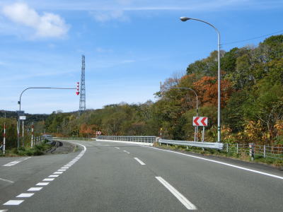 | 急カーブに注意を促す標識を通過した後に反対側車線の駐車帯の前を通過して左カーブを曲がると登坂車線と同時に中央分離帯が現れる。ヘアピンカーブのようなカーブはないがそれなりの急なカーブが連続する状態を走る。登坂車線が終わる辺りで天北峠を越えて中頓別町に入る。反対側車線に登坂車線があるためか、中央分離帯はまだなくならない。 | ||