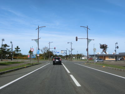 | 閉鎖用ゲートを通り過ぎて少し走ると浜頓別町の市街地に入る。浜頓別町役場の北東で北海道r84交差点となり、右折して稚内・枝幸方面に進む。町役場の反対側の東側には浜頓別駅跡がある。 | ||