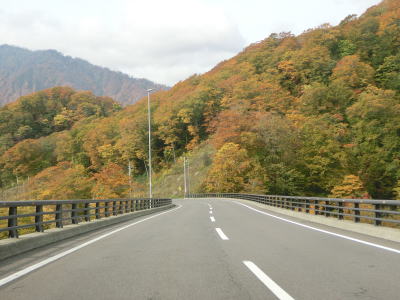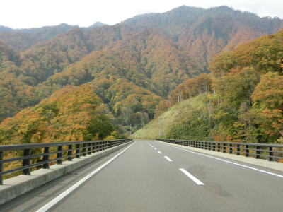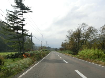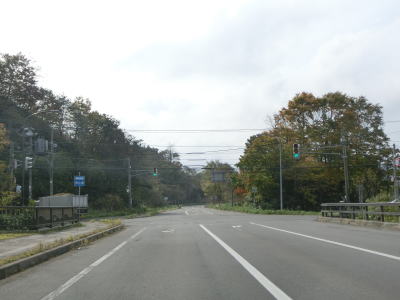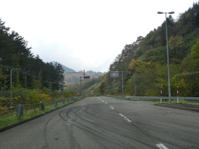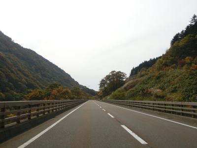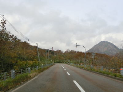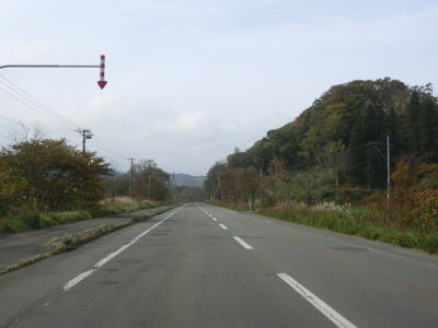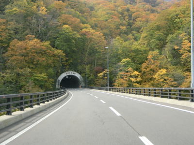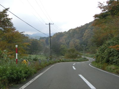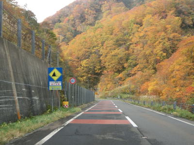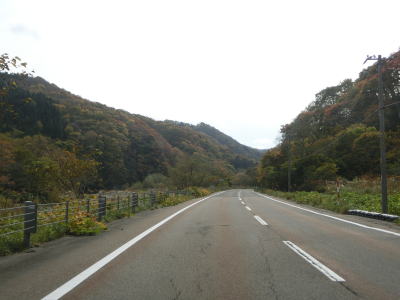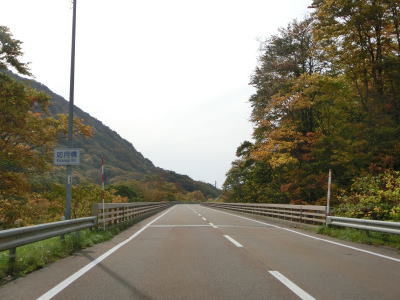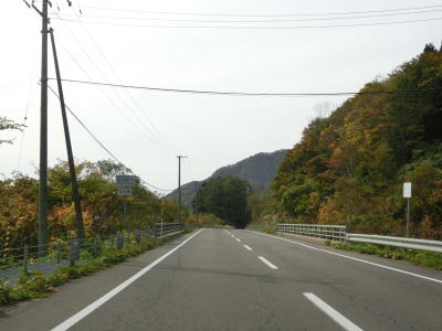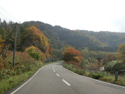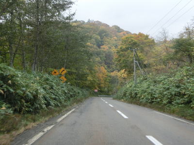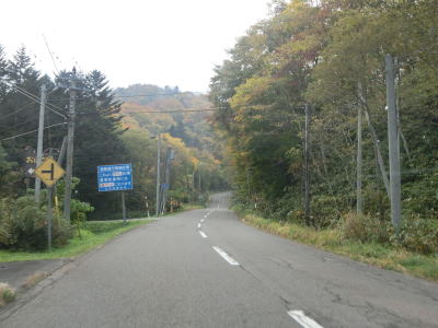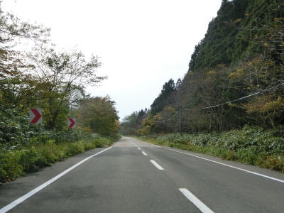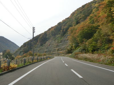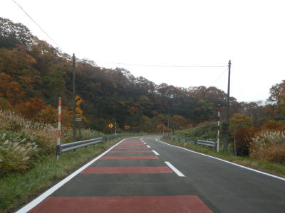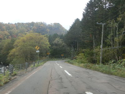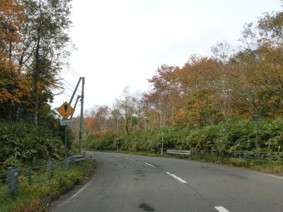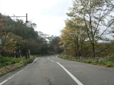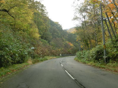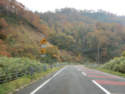 | 雲石峠を越えると下りとなるが、その勾配は7〜8%と旧八雲町側と比べて大きな差はない。ヘアピンカーブほどではないものの急なカーブは存在しており、落石に注意を要する延長310mの区間がある。眺望は利かないがちょうど紅葉の時期だったため色付いた木々がちょうど良いアクセントになっていた。 | ||