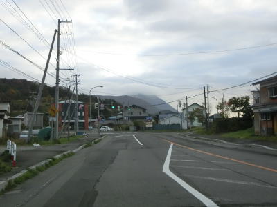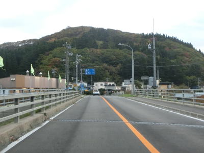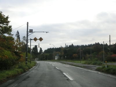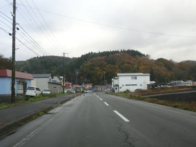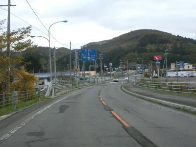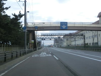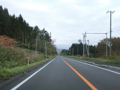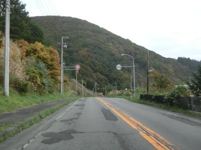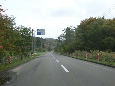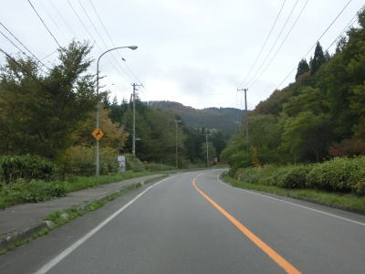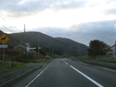 | 標高30m程度の内陸部を走っているが、少ないながらも沿線に家屋が建っている。少し離れた位置にある上下線の駐車帯を通過しながら2車線道路を走る。動物に注意を促す警戒標識が立っているが、通常は鹿の絵が描かれているが、ここには馬の絵が描かれている。緩やかなカーブが連続している5%の勾配を下っていると旧道らしき市道との交差点を通過する。 | ||