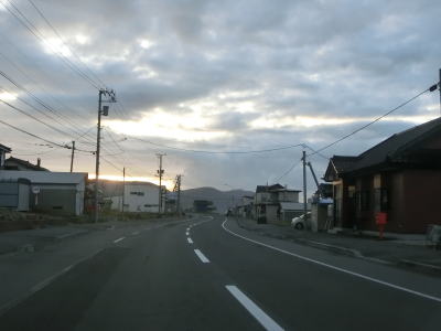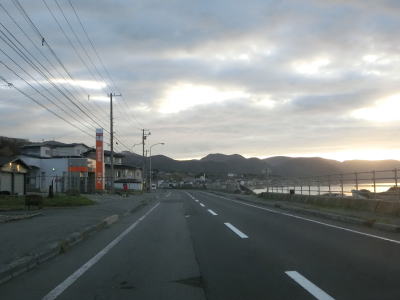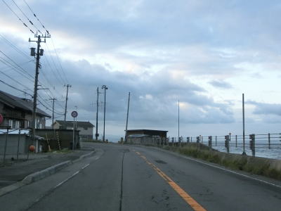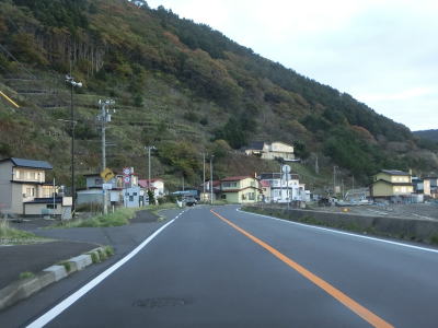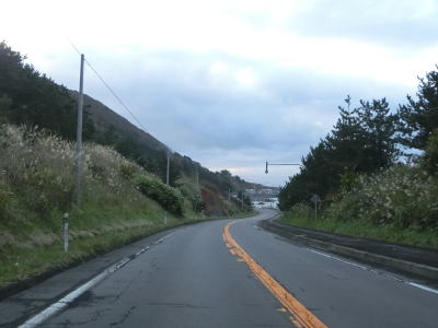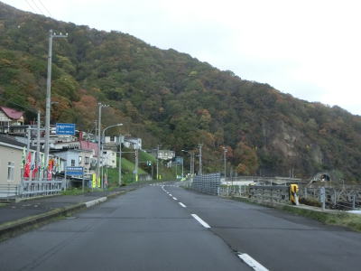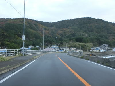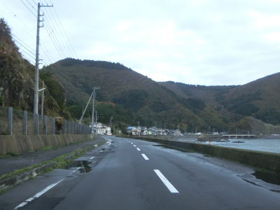 | 汐首岬を過ぎてからも途切れる事なく集落が続いているが、山が海に迫った場所のため平地はすくない。小規模な漁港をいくつか通過していると左にカーブして市道との交差点を通過する。交差点の形状からして浜町方面の市道は旧道と思われる。 | ||