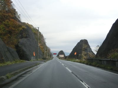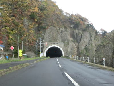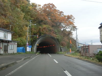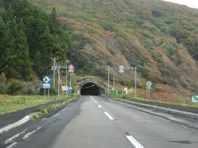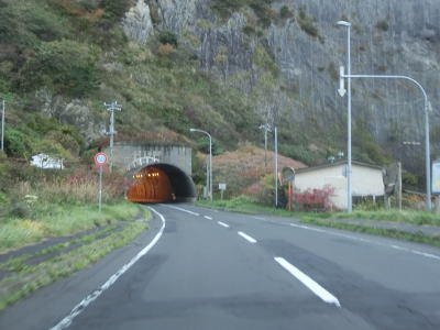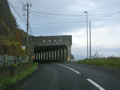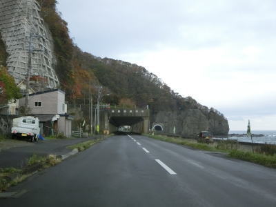 | 戸井トンネルを出てからも海岸線沿いを走り、北海道r970交差点を通過する。さらに少し走ると日浦トンネルをくぐるが、旧道と思われる海岸線の道路は一部は廃道と化しており通行できない。日浦川を渡ってすぐにサンタロトンネルに入る。トンネルの手前には北海道r41が交差しているが、案内標識もないため道道との交差点には見えない。 | ||