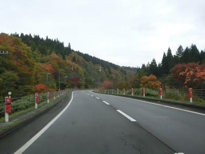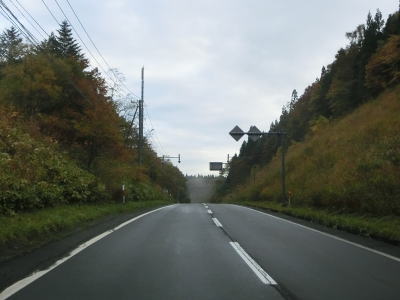 | 紅葉川の流域の緩やかな上り勾配の2車線道路を走る。駐車スペースだけの駐車帯が設置されているが、その案内標識に森町までの距離が表記されている。紅葉川の源流付近を過ぎた後に峠部分を越えて下り勾配に転ずる。 | ||