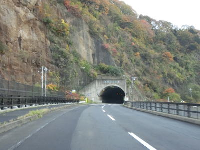 | 旧椴法華村の中心部の北端で銚子トンネルと滝の沢トンネルを相次いでくぐるが、古部ロックシェッドが2つのトンネルを繋いでいる。銚子トンネルの全長が1437m、滝の沢トンネルの全長が850mであり、古部ロックシェッドを合わせた距離は2.5km程度である。 古部漁港付近で古部大橋を渡るが、銘板には河川名ではなく“太平洋”と書かれている。ただし、厳密に言うと海上ではなく漁港の一部の上を通っている。古部大橋を渡り終えると古部トンネルと獅子岩隧道をくぐるが、このトンネルの間にもロックシェッドがあり、その距離は2つのトンネルよりも長い。 |
