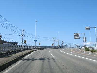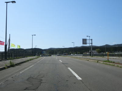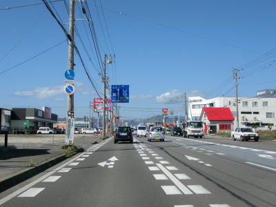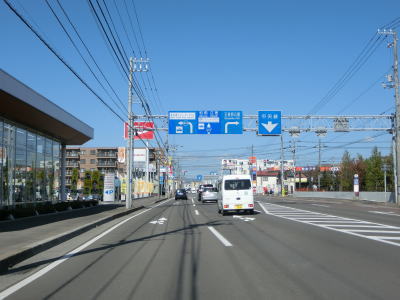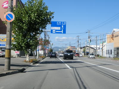 | 函館湾に沿って左カーブを描いている片側2車線道路を走る。電光掲示板にはこの先の工事規制の情報が表示されているが、日本語と英語が交互に表示されるようになっている。これは外国人ドライバーを多い事を意味しており、その多くはレンタカーだと思われる。 七重浜7交差点から約7.6kmでR228のバイパスでもあるE59函館江差道の北斗富川ICを通過する。手前の案内標識では右側車線がインターチェンジへの右折車線になるかのように表示されているが、実際は交差点を過ぎた直後に右側車線がなくなる。 |