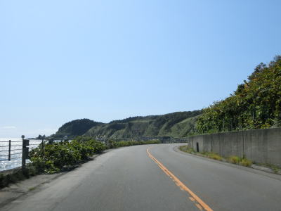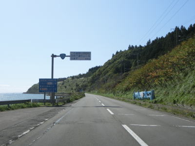 | 矢不来集落を過ぎると道路通行規制区間に入る。雨量が110mmを超えると2.3kmの区間が通行止となる。規制区間内は海岸線ギリギリを走っており、雨だけでなく強風時も通行止になりそうな感じである。津軽海峡越しには竜飛崎らしき陸地も見える。茂辺地集落の手前で茂辺地大橋を渡るが、かつてはその東側に茂辺地トンネルがあった。通行規制区間はこの茂辺地大橋付近までである。 | ||
