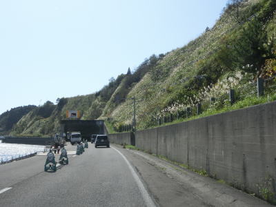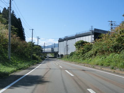 | 対面2車線道路になるのと同時に海岸線沿いを走るようになる。矢不来覆道は工事のため片側交互通行規制が敷かれていたが、覆道そのものが工事の対象ではなくその前後の路肩部分を工事していた。工事現場を過ぎると矢不来集落を通過する。 | ||