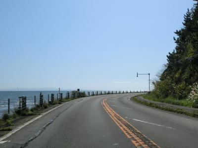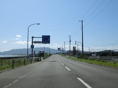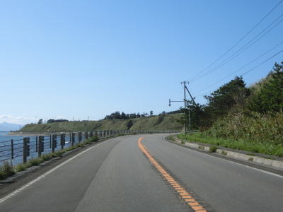 | 右カーブを曲がってサラキ岬を通過する。岬の近くに駐車場があってとるぱにも指定されているが、駐車場は砂利敷きでトイレは設置されていない。咸臨丸の復元模型が置かれているので何か縁があるのかもしれない。その後はいくつかの集落を通り抜けながら海に沿った2車線道路を走る。カーブは多いが緩やかなものばかりなので走りやすい道路状況である。 | ||