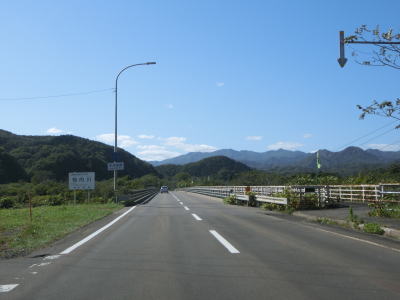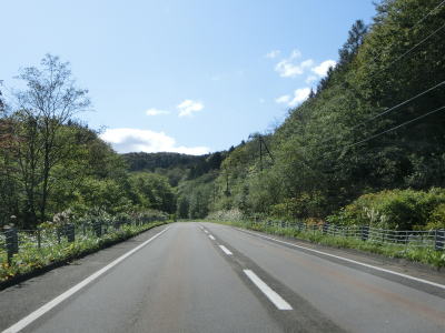 | 北海道r531との交差点のすぐ先で知内町役場の近くを通り、知内橋を渡る。橋を渡り終えてからは大きく右にカーブして進行方角を西へと転ずる。知内町の中心部からは海を離れた内陸を走る。かつて並走していたJR松前線も同様に内陸を通っていた。知内町の中心部から出た直後に町営スキー場の北側を通過するが、この辺りだけは山が川に迫っている場所を通っているのだが、特段走りにくい道路状況とも言えない。以降は知内川の流域の平坦な2車線道路を快走する。 | ||