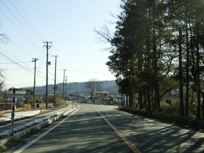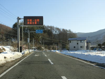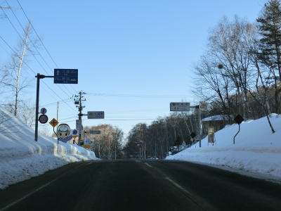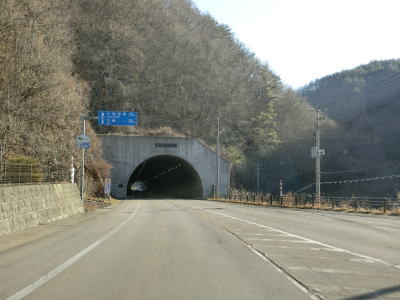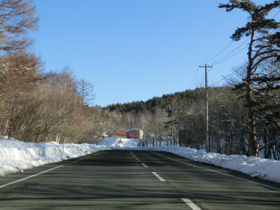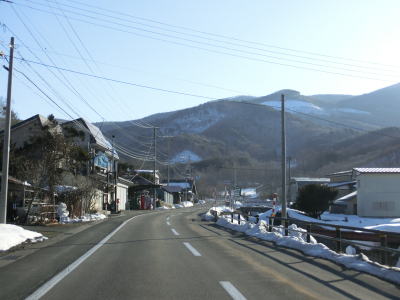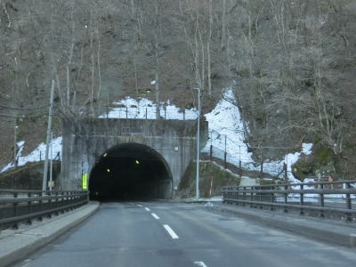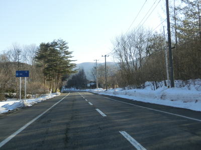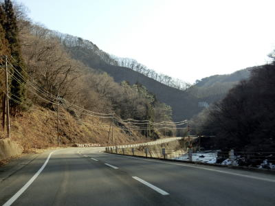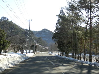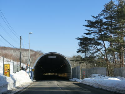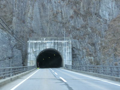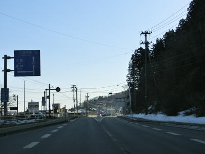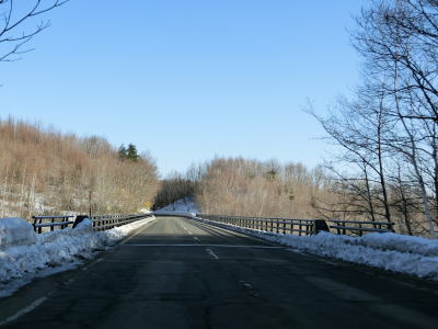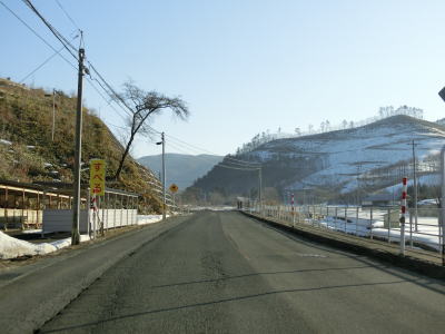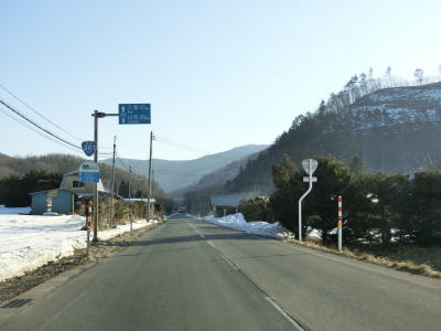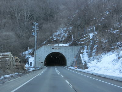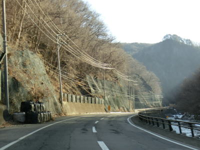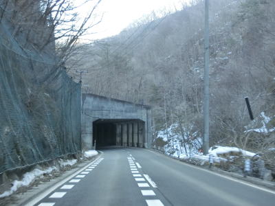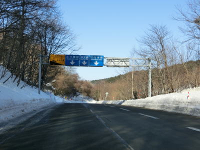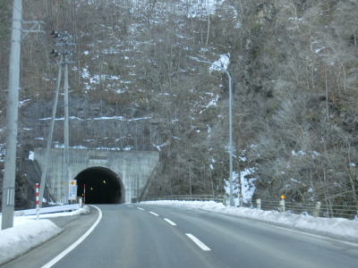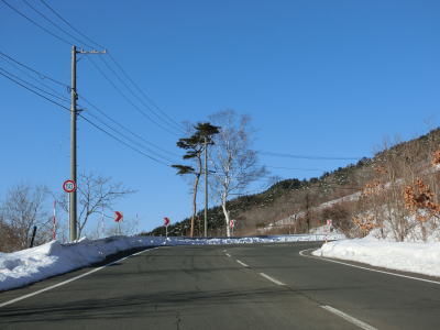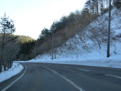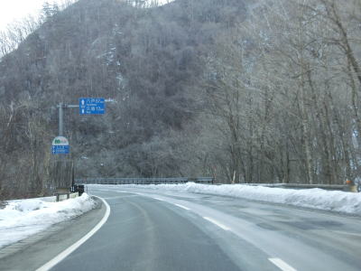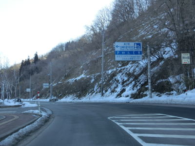 | 緩やかなカーブが連続する緩やかな下り勾配の2車線道路と淡々と下る。前述のとおり路側帯が残雪で埋まっているが、交通量が少ないため走りにくさはさほど感じない。来内集落に向かう市道との交差点の直後にスノーシェッドをくぐる。 | ||