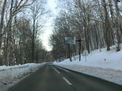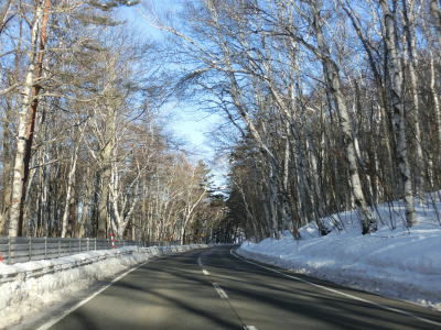 | 97.岩手r29以降はやや狭い | 98.路面には圧雪が残っていた | 99.白樺林の中を下る |